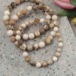Stylowy komplet trzech bransoletek wykonanych z naturalnych kamieni to propozycja dla osób ceniących elegancję w naturalnym wydaniu. Bransoletki łączą w sobie kamienie agatu, jaspisu krajobrazowego oraz kamieni rzecznych o średnicach 6 i 8 mm, w ciepłych odcieniach brązu, beżu i kości słoniowej.