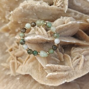Malachit, choć syntetyczny, zachowuje swój charakterystyczny, przyciągający wzrok rysunek – symbol transformacji i ochrony. Złoty hematyt dodaje całości elegancji i energetycznego balansu. Elastyczna gumka zapewnia wygodne dopasowanie do palca, a całość sprawdzi się zarówno na co dzień, jak i do bardziej wyrazistych stylizacji.