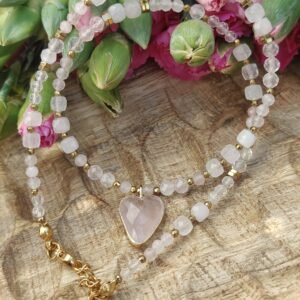 Kamienie zostały przełamane eleganckimi przekładkami ze złotego hematytu, które dodają całości nowoczesnego charakteru i luksusowego wykończenia. Centralnym punktem naszyjnika jest urocza zawieszka w kształcie serca wykonana z różowego kwarcu – symbol miłości, delikatności i pozytywnej energii.