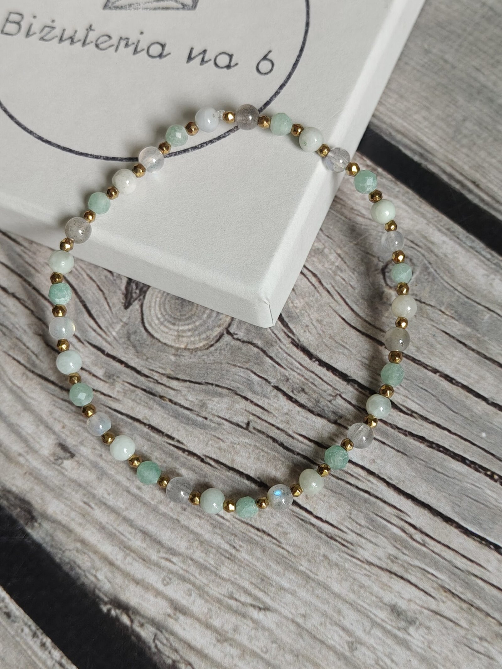 Dzięki stonowanej kolorystyce – odcieniom zieleni, szarości i złota – bransoletka doskonale komponuje się zarówno z codziennymi, jak i bardziej eleganckimi stylizacjami. To minimalistyczny talizman, który dyskretnie przypomina o Twojej intencji – żyć z lekkością i otwartością na szczęście.