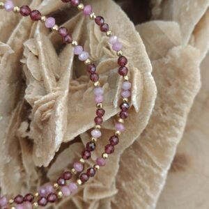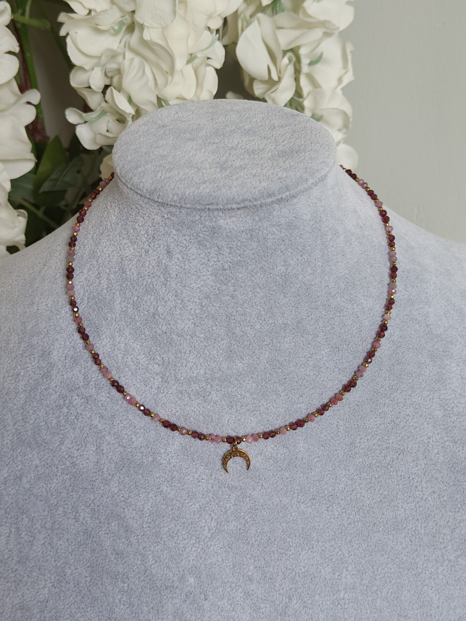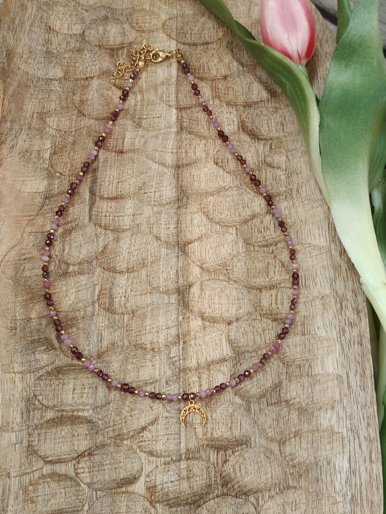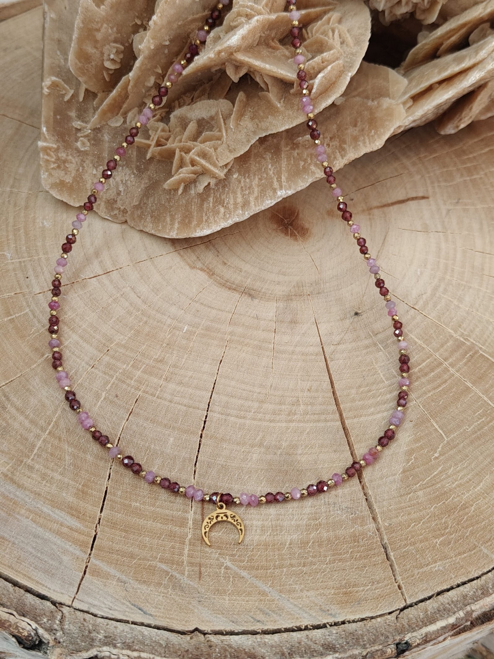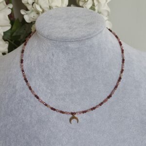 Połączenie głębokiego granatu z subtelnym różem turmalinu tworzy harmonijną kompozycję kolorystyczną, którą uzupełniają złote akcenty hematytu. Całość dopełnia minimalistyczna zawieszka w kształcie lunuli ze stali chirurgicznej, nadająca biżuterii lekko mistycznego i kobiecego wyrazu.