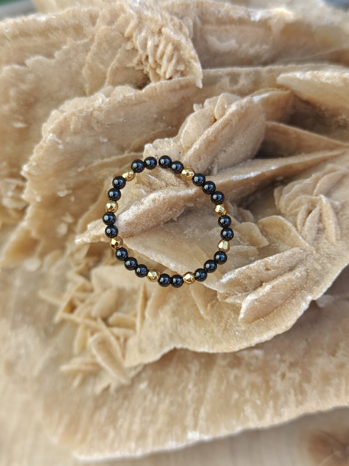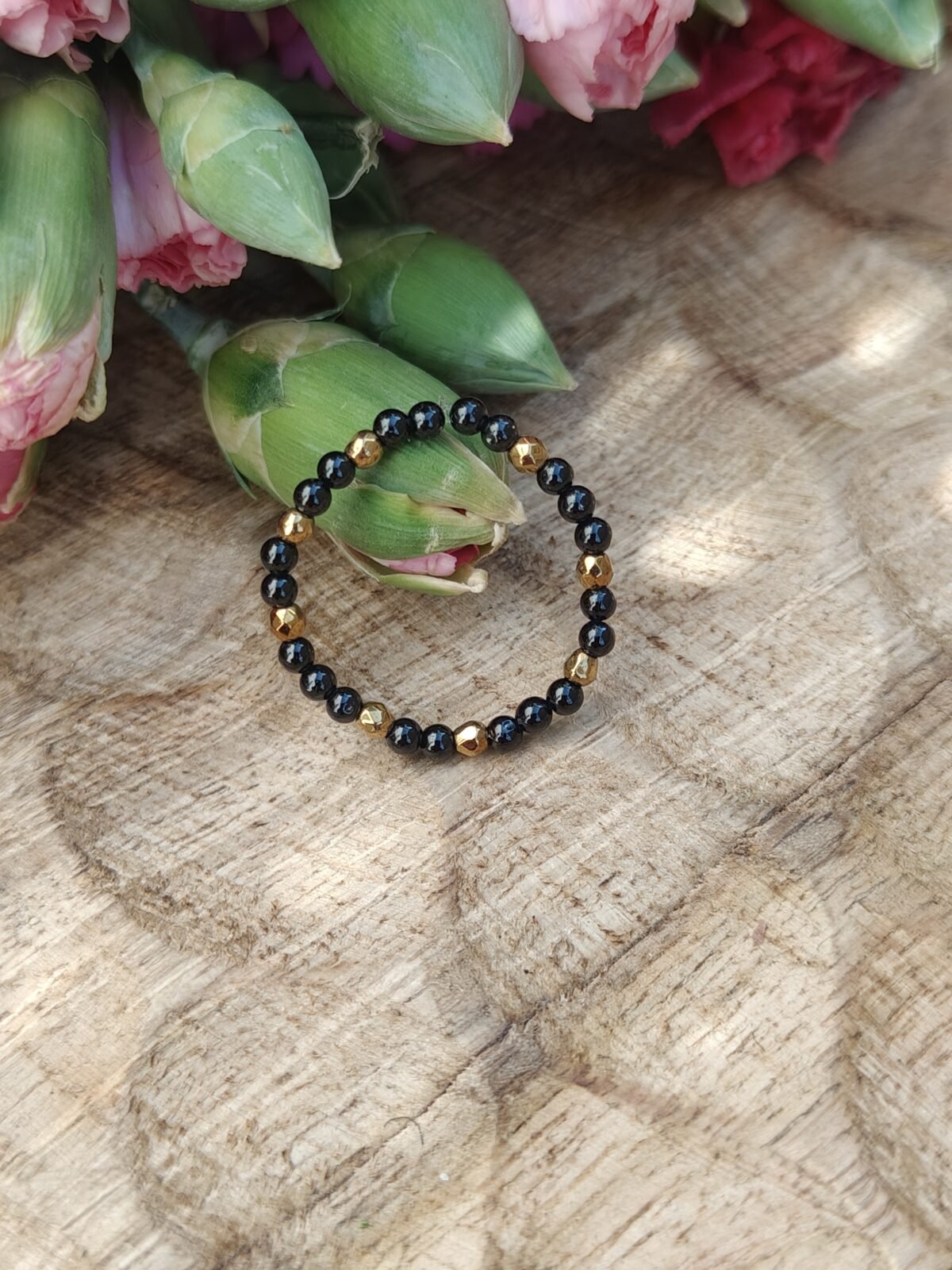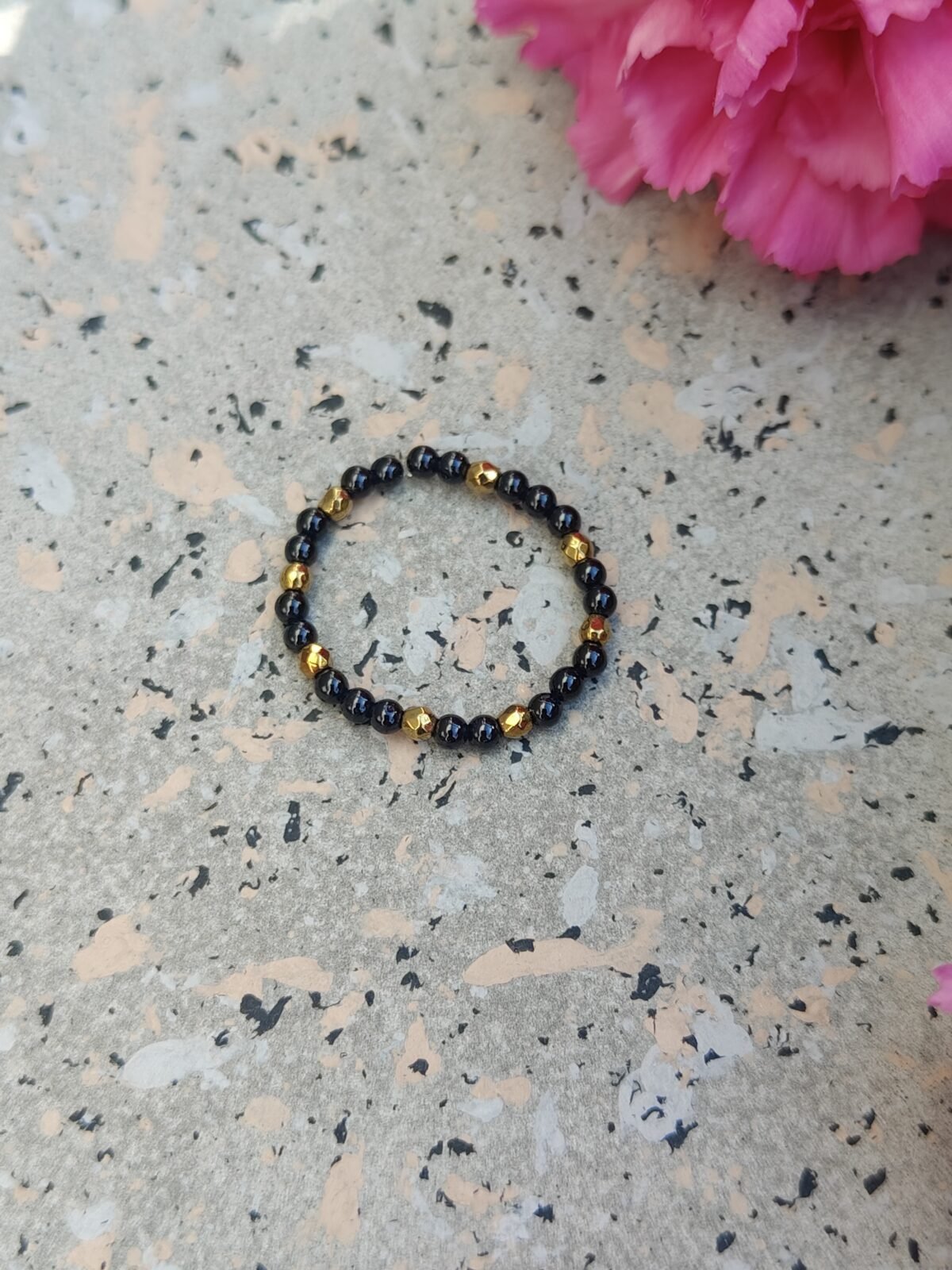 Głęboka czerń onyksu została przełamana delikatnymi akcentami złotego hematytu, które nadają pierścionkowi elegancji i nowoczesnego blasku. To połączenie sprawia, że biżuteria jest uniwersalna – pasuje zarówno do codziennych stylizacji, jak i bardziej eleganckich zestawów.