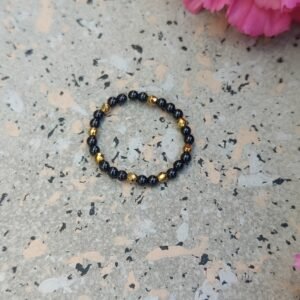 Malachit, choć syntetyczny, zachowuje swój charakterystyczny, przyciągający wzrok rysunek – symbol transformacji i ochrony. Złoty hematyt dodaje całości elegancji i energetycznego balansu. Elastyczna gumka zapewnia wygodne dopasowanie do palca, a całość sprawdzi się zarówno na co dzień, jak i do bardziej wyrazistych stylizacji.