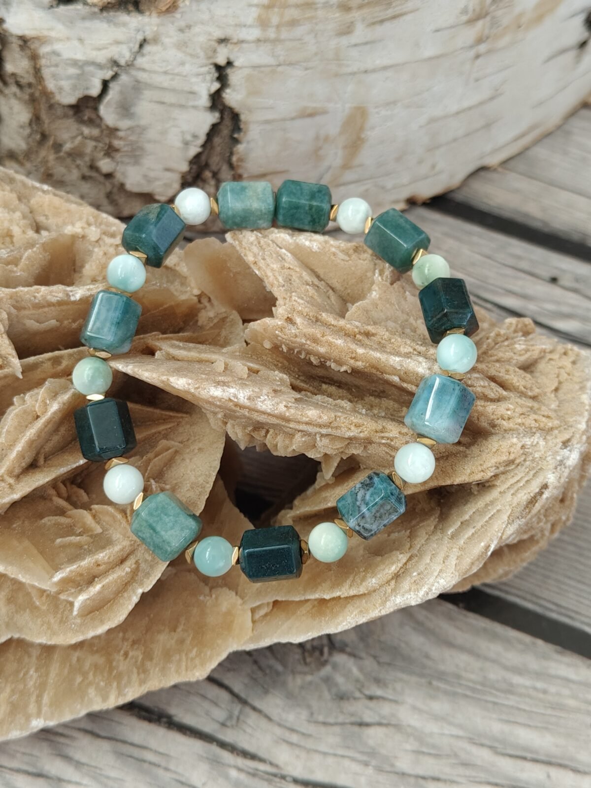 Agat mszysty zachwyca swoją organiczną strukturą przypominającą roślinne inkluzje, które tworzą niepowtarzalne, zielone wzory w każdym kamieniu. W połączeniu z delikatnym, pastelowym odcieniem zielonego angelitu bransoletka zyskuje świeży, wiosenno-letni charakter, idealny na cieplejsze dni.