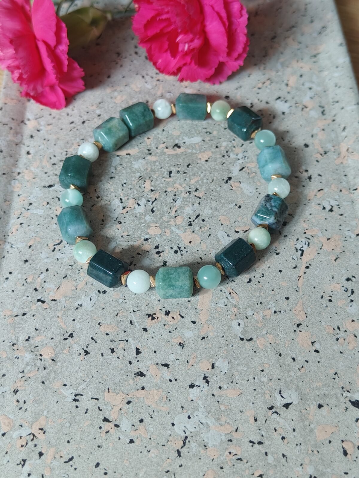 Wyjątkowa bransoletka wykonana z naturalnych kamieni – agatu mszystego w formie baryłek oraz zielonego angelitu w postaci gładkich kulek – to idealna propozycja dla miłośników lekkiej, świeżej biżuterii inspirowanej naturą. Całość została wzbogacona eleganckimi akcentami ze złotego hematytu, które dodają kompozycji szlachetnego charakteru.