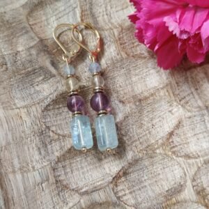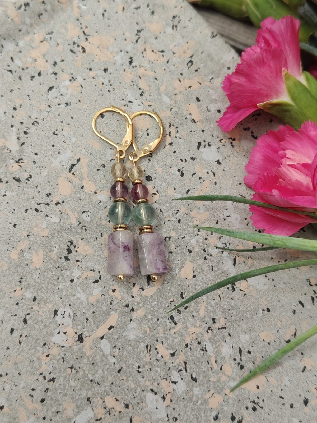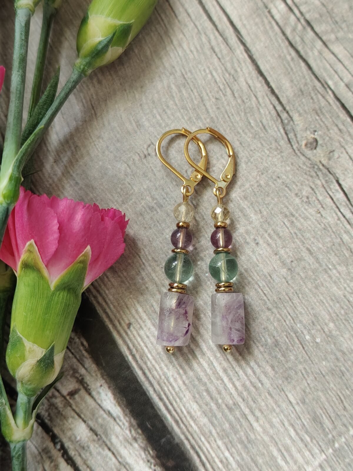 Kolczyki zostały osadzone na wygodnych i bezpiecznych biglach angielskich ze stali, które zapewniają trwałość oraz komfort noszenia – także dla osób o wrażliwej skórze. Naturalny fluoryt wyróżnia się pięknymi odcieniami zieleni, fioletu, i słoneczną żółcią dzięki czemu każdy egzemplarz jest unikalny.