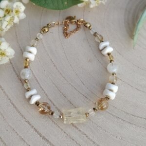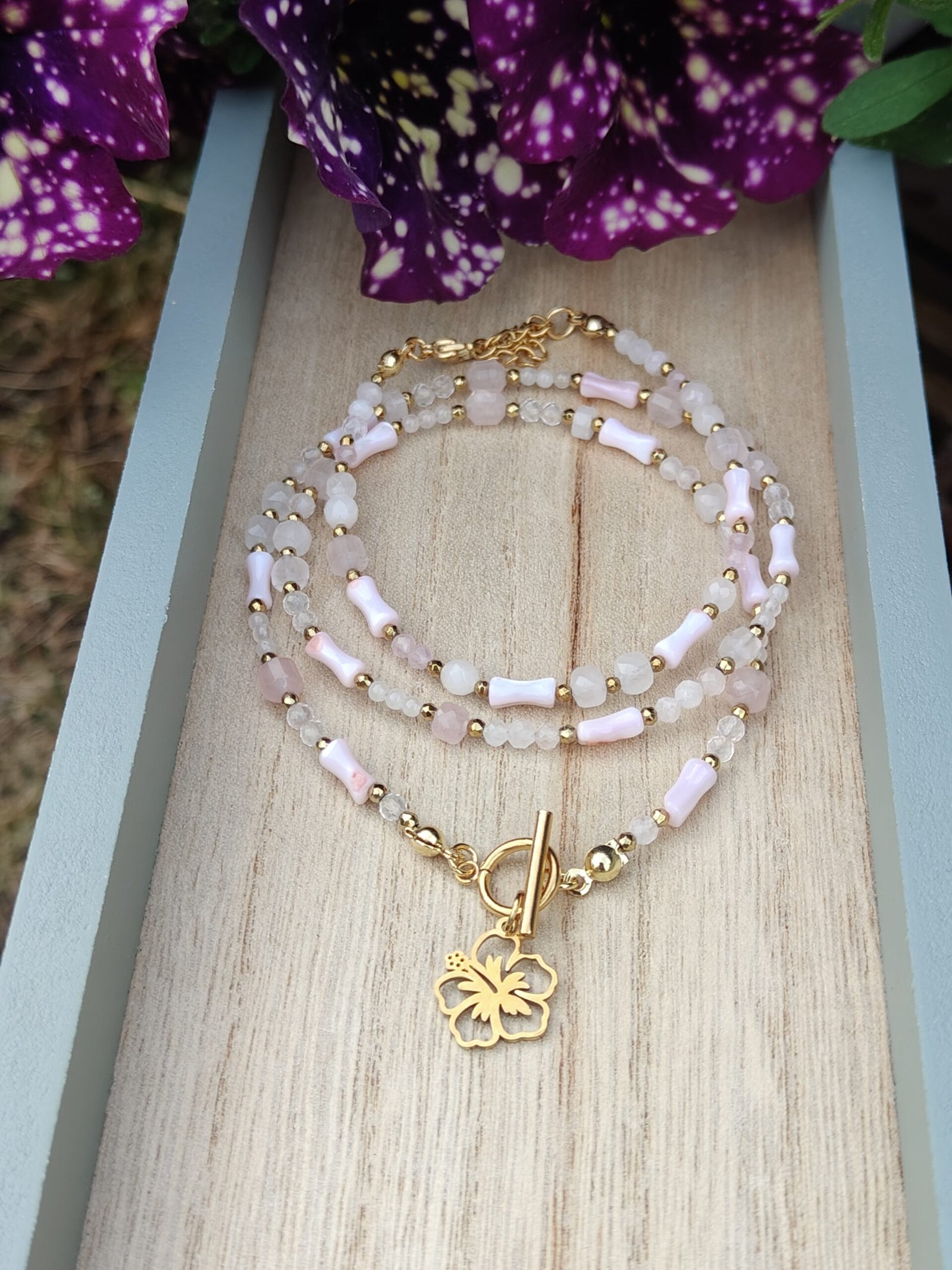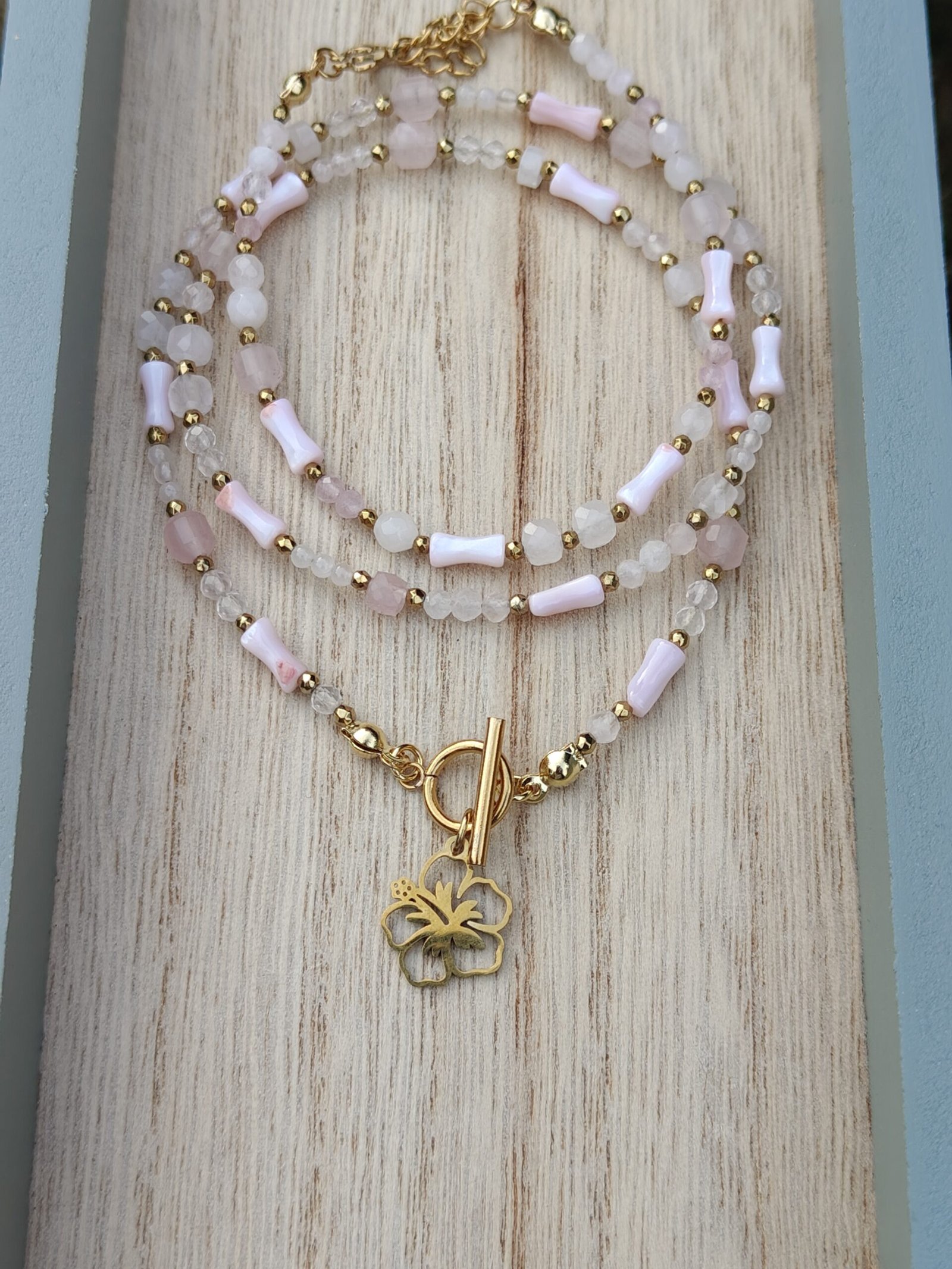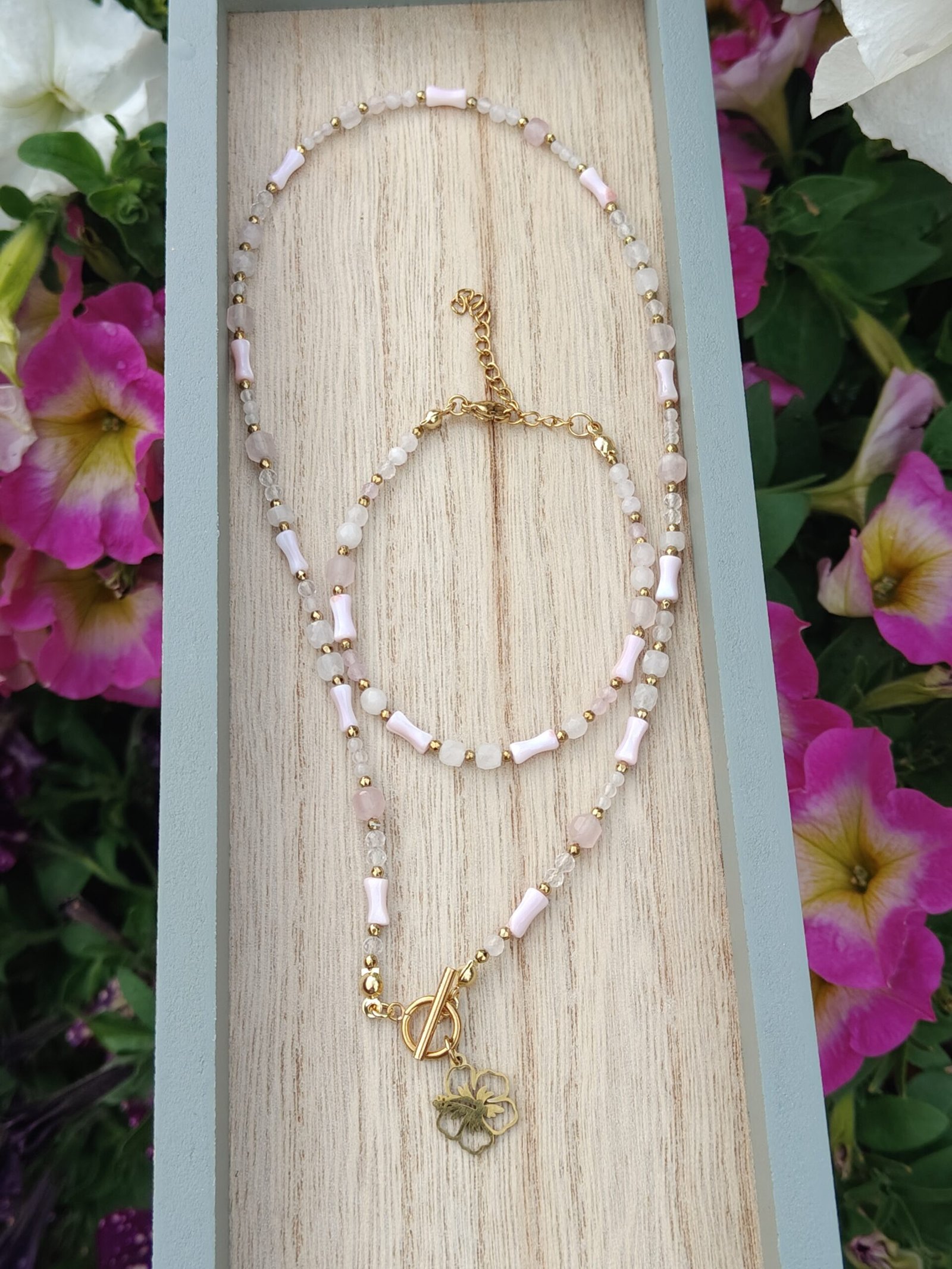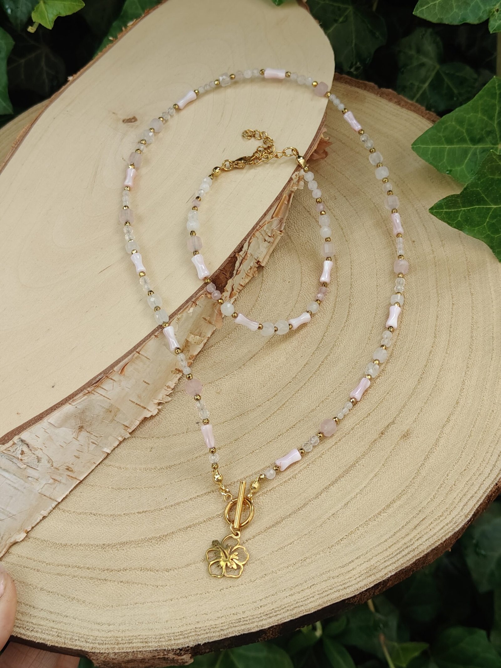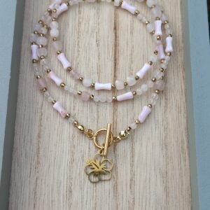 Delikatny komplet biżuterii, w którym króluje subtelność i kobiecość. „Dotyk Miłości” to połączenie łagodnego kwarcu różowego – kamienia serca i harmonii – z eleganckim blaskiem złotego hematytu i delikatną masą perłową w różowym odcieniu.