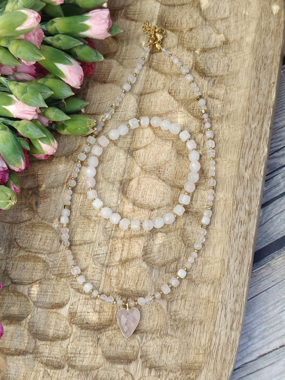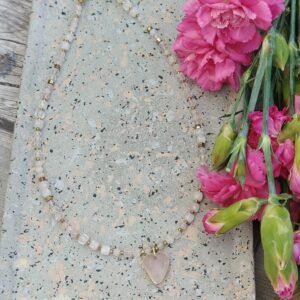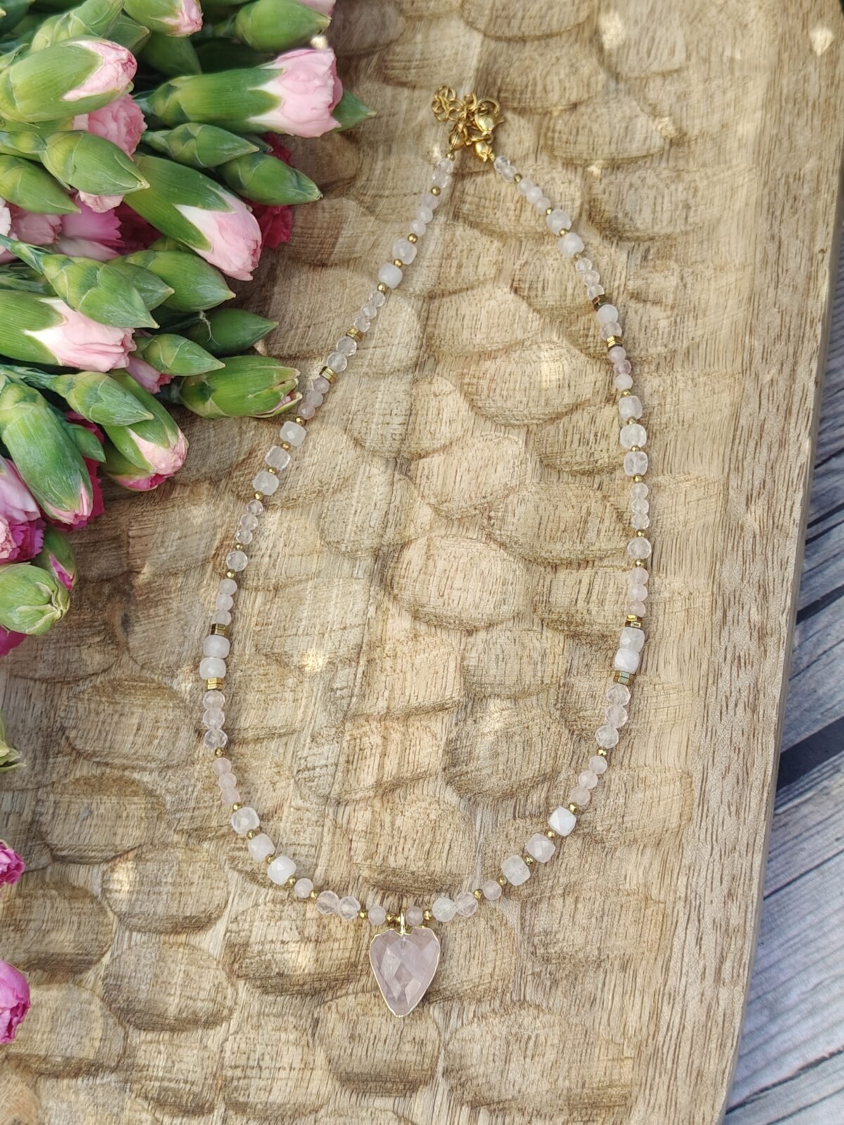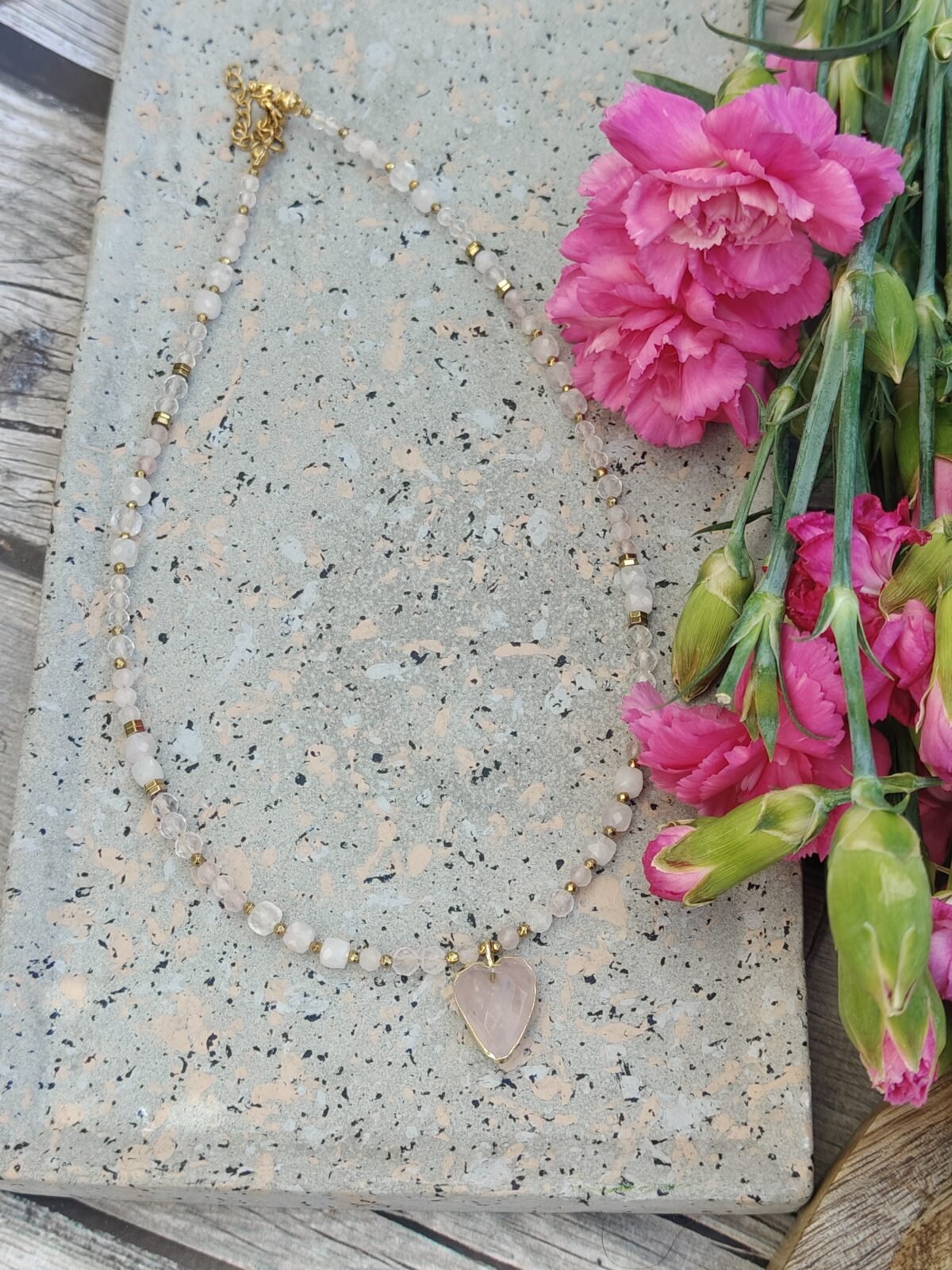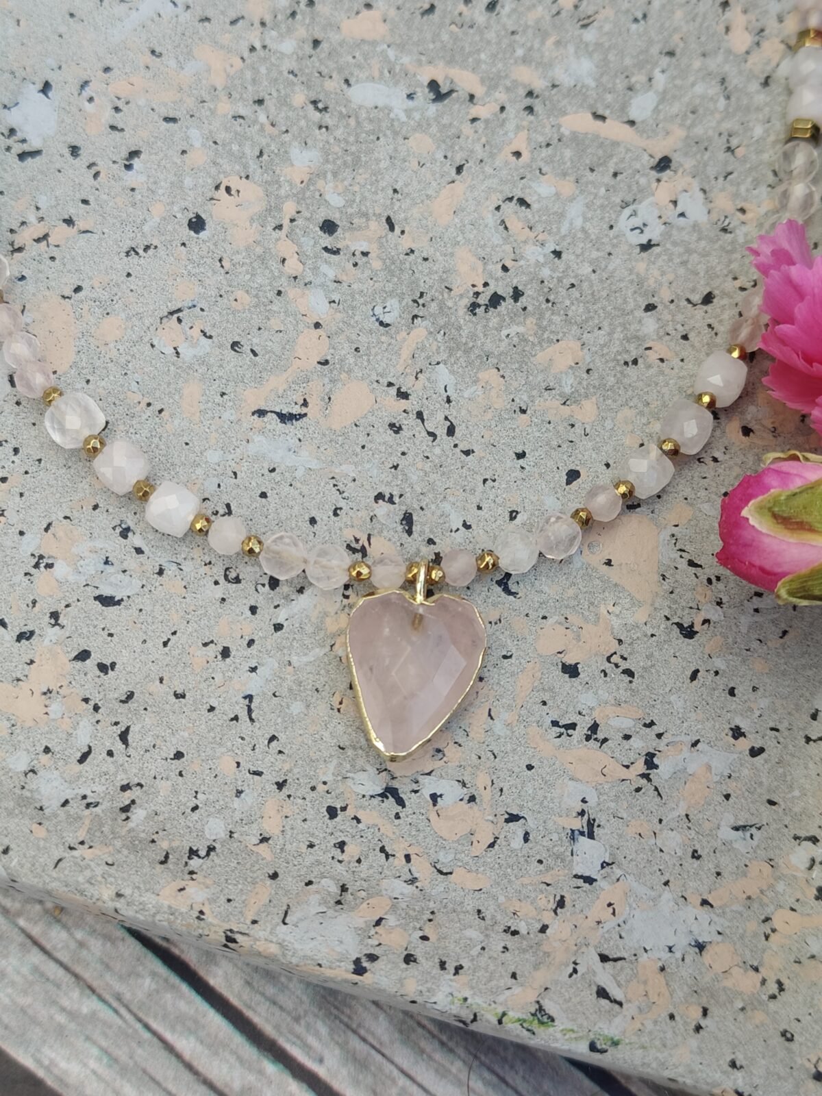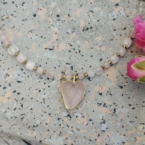 Kamienie zostały przełamane eleganckimi przekładkami ze złotego hematytu, które dodają całości nowoczesnego charakteru i luksusowego wykończenia. Centralnym punktem naszyjnika jest urocza zawieszka w kształcie serca wykonana z różowego kwarcu – symbol miłości, delikatności i pozytywnej energii.