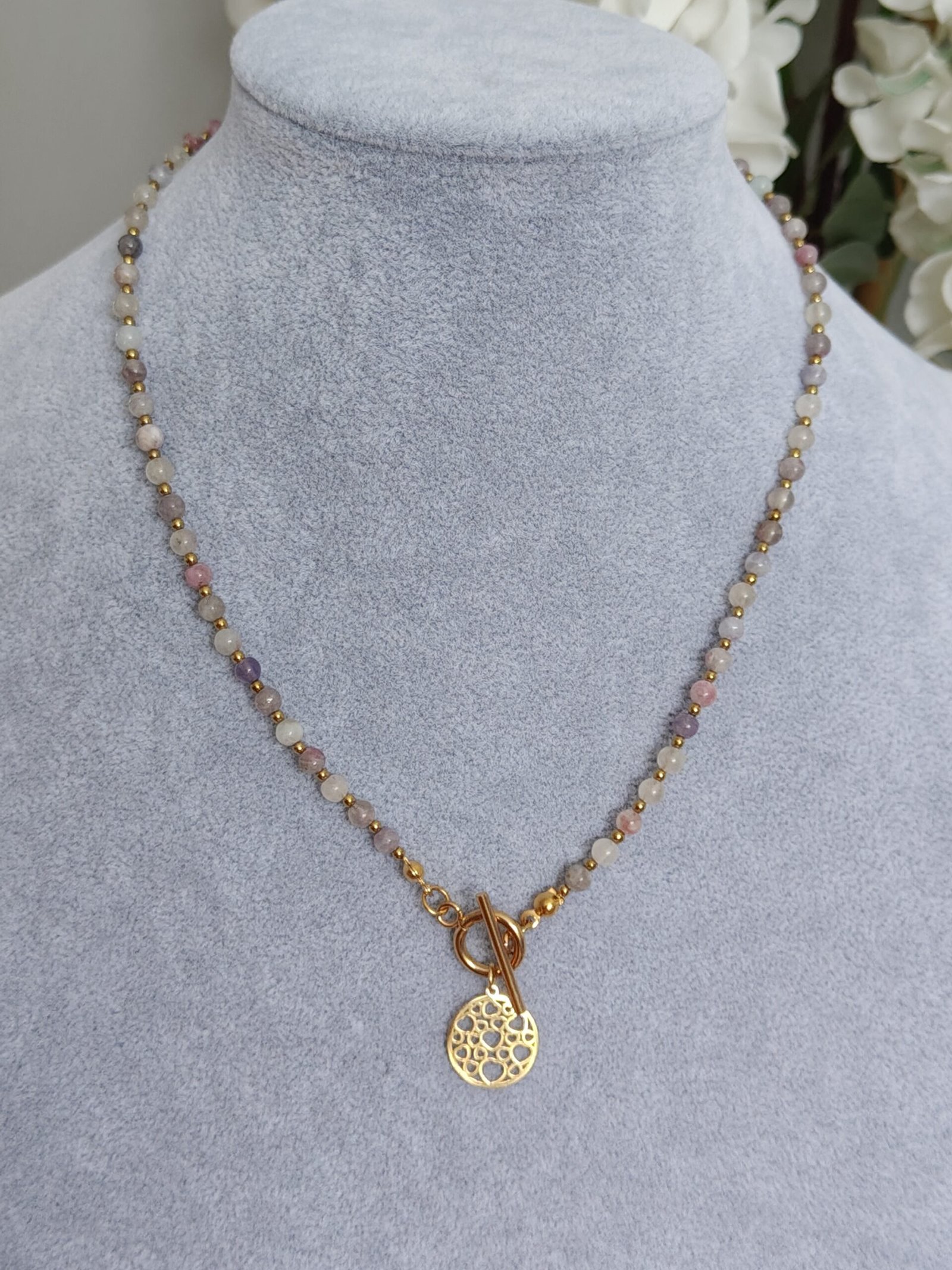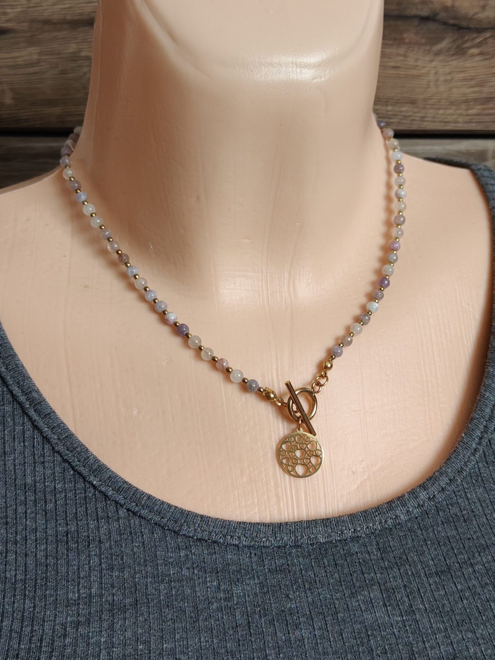 Połączenie chłodnego liliowego tonu z ciepłym złotem sprawia, że naszyjnik doskonale komponuje się zarówno z jasnymi, jak i ciemnymi stylizacjami.