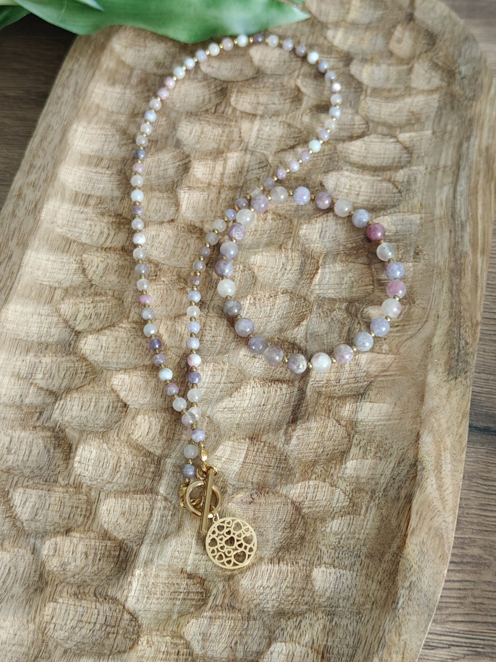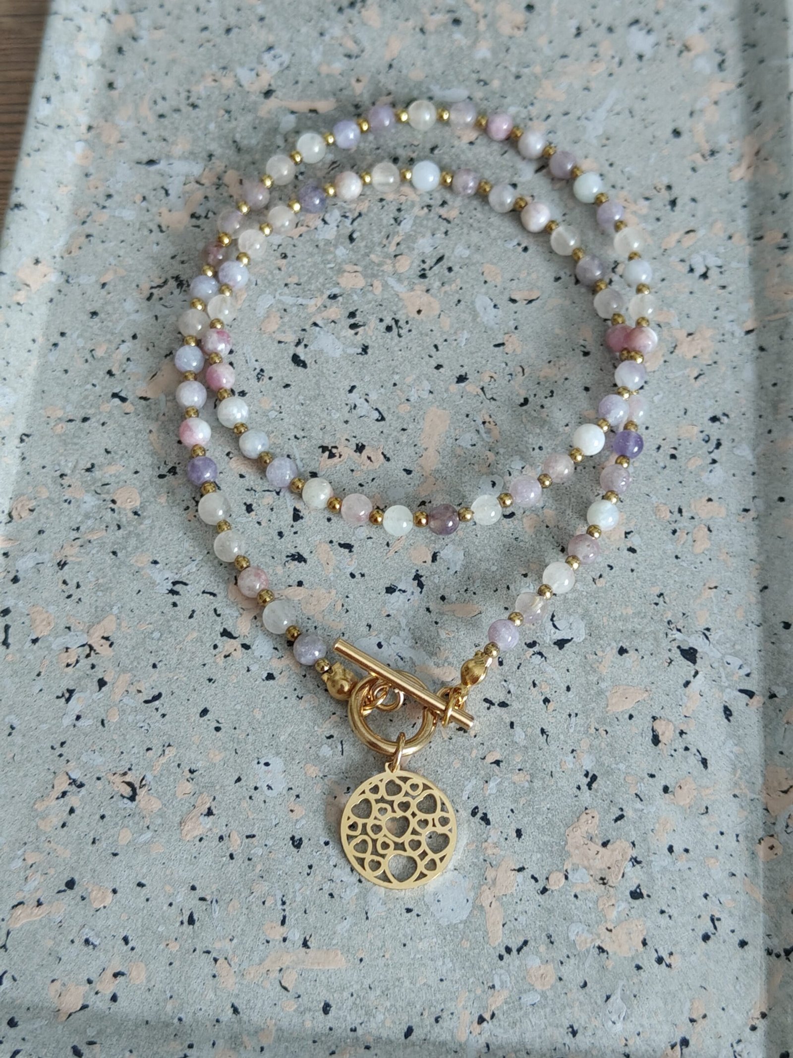 Odkryj subtelne piękno naturalnych kamieni. Ten wyjątkowy naszyjnik z turmalinu purpurowego i złotego hematytu zachwyca delikatnym, liliowym odcieniem oraz eleganckim połyskiem złotych akcentów. To biżuteria stworzona dla kobiet, które cenią minimalizm, lekkość i ponadczasowy styl.
