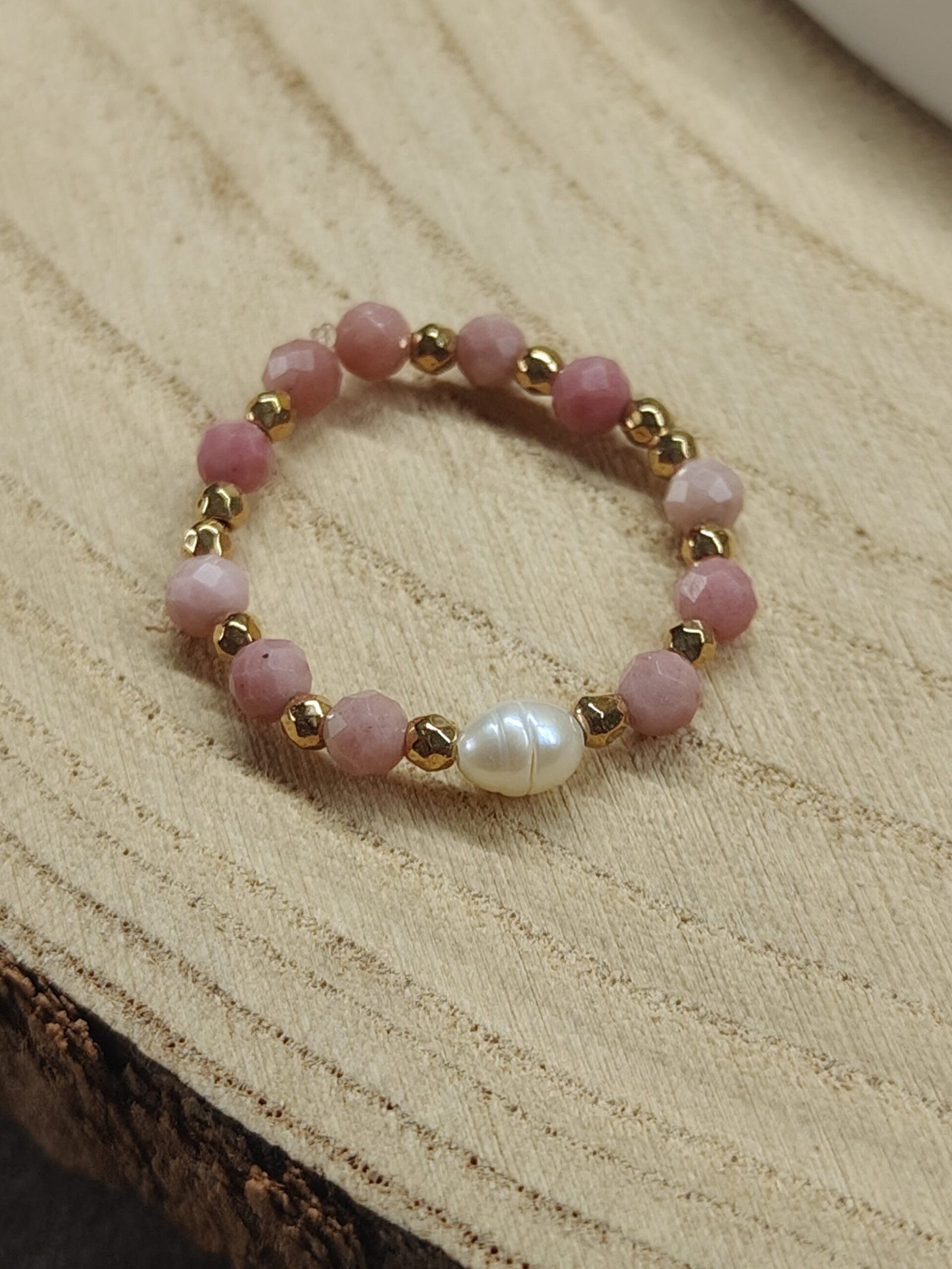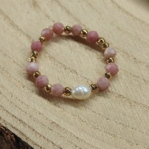 Delikatny, a jednocześnie pełen symboliki pierścionek „Serce Oceanu” to połączenie trzech kamieni o wyjątkowej energii. Różowy rodonit wspiera miłość własną, harmonię i uzdrawianie emocji. Naturalna perła symbolizuje kobiecą siłę, intuicję i czystość, a złoty hematyt dodaje odwagi oraz pomaga zachować wewnętrzną równowagę.