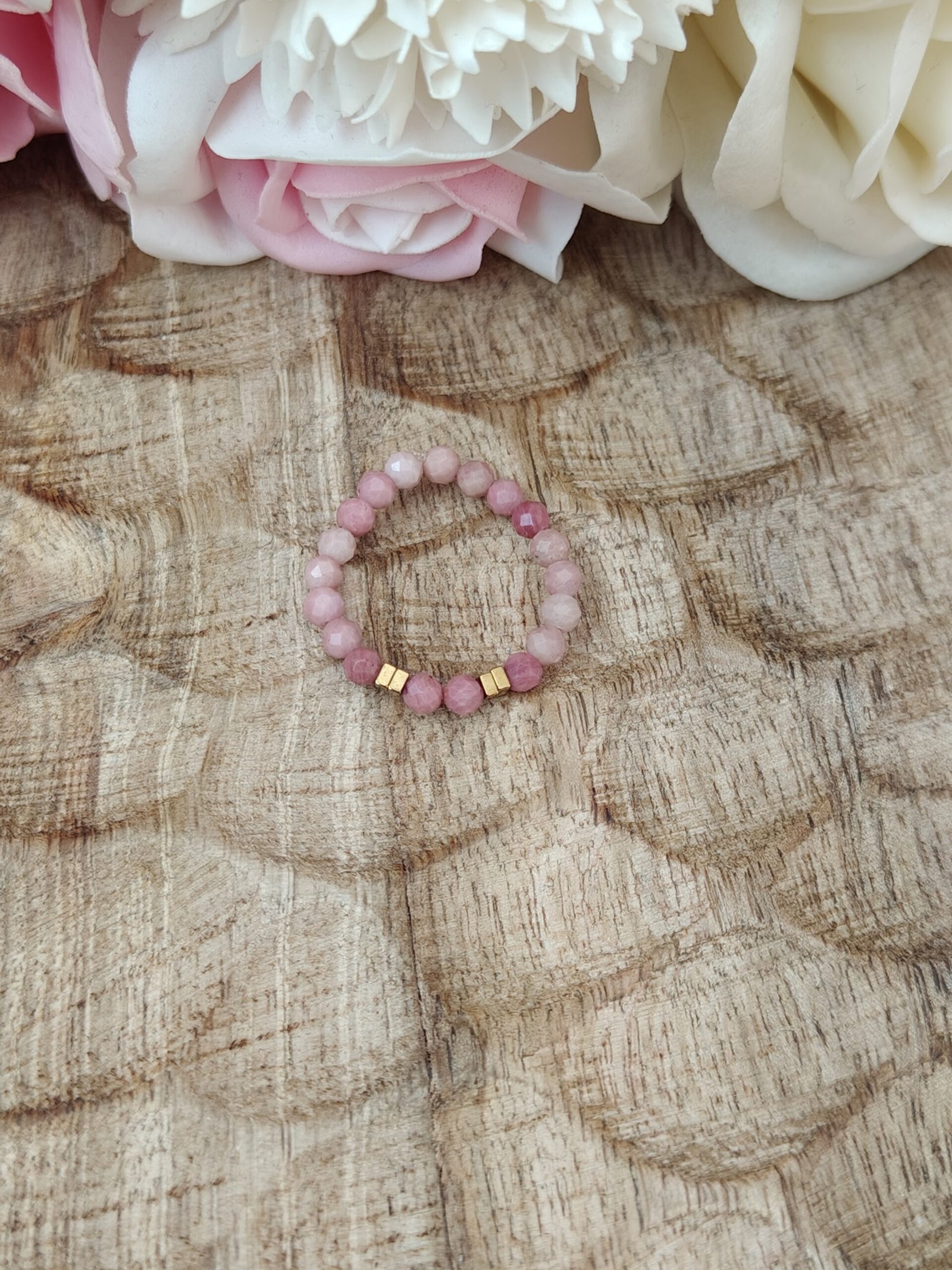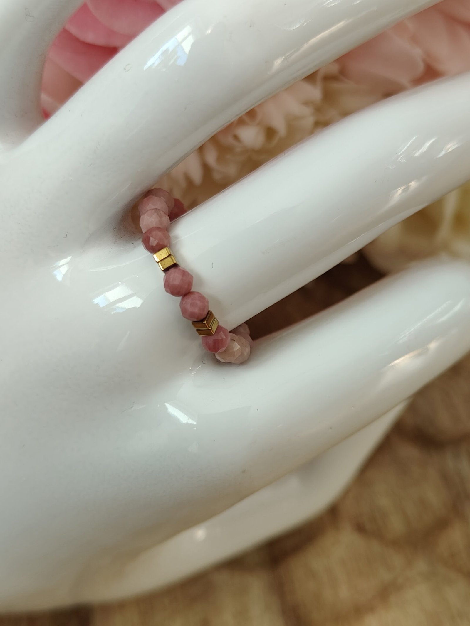 Hematyt w złotej odsłonie nadaje pierścionkowi subtelnego blasku oraz wspiera właściwości energetyczne rodonitu: