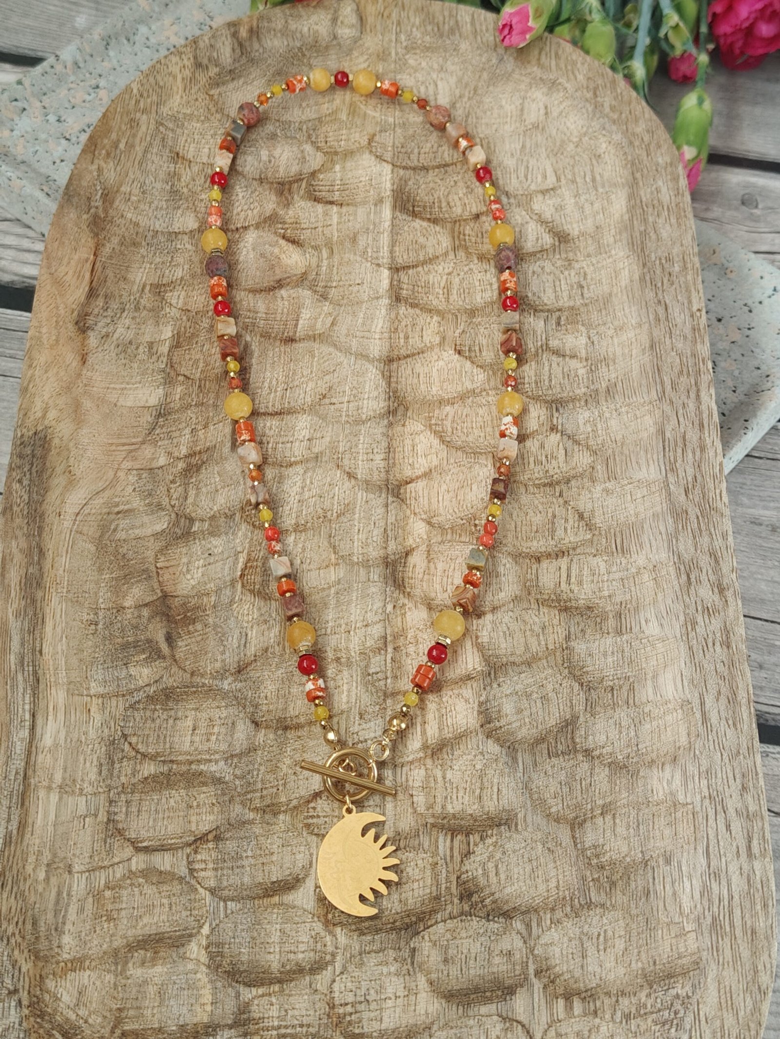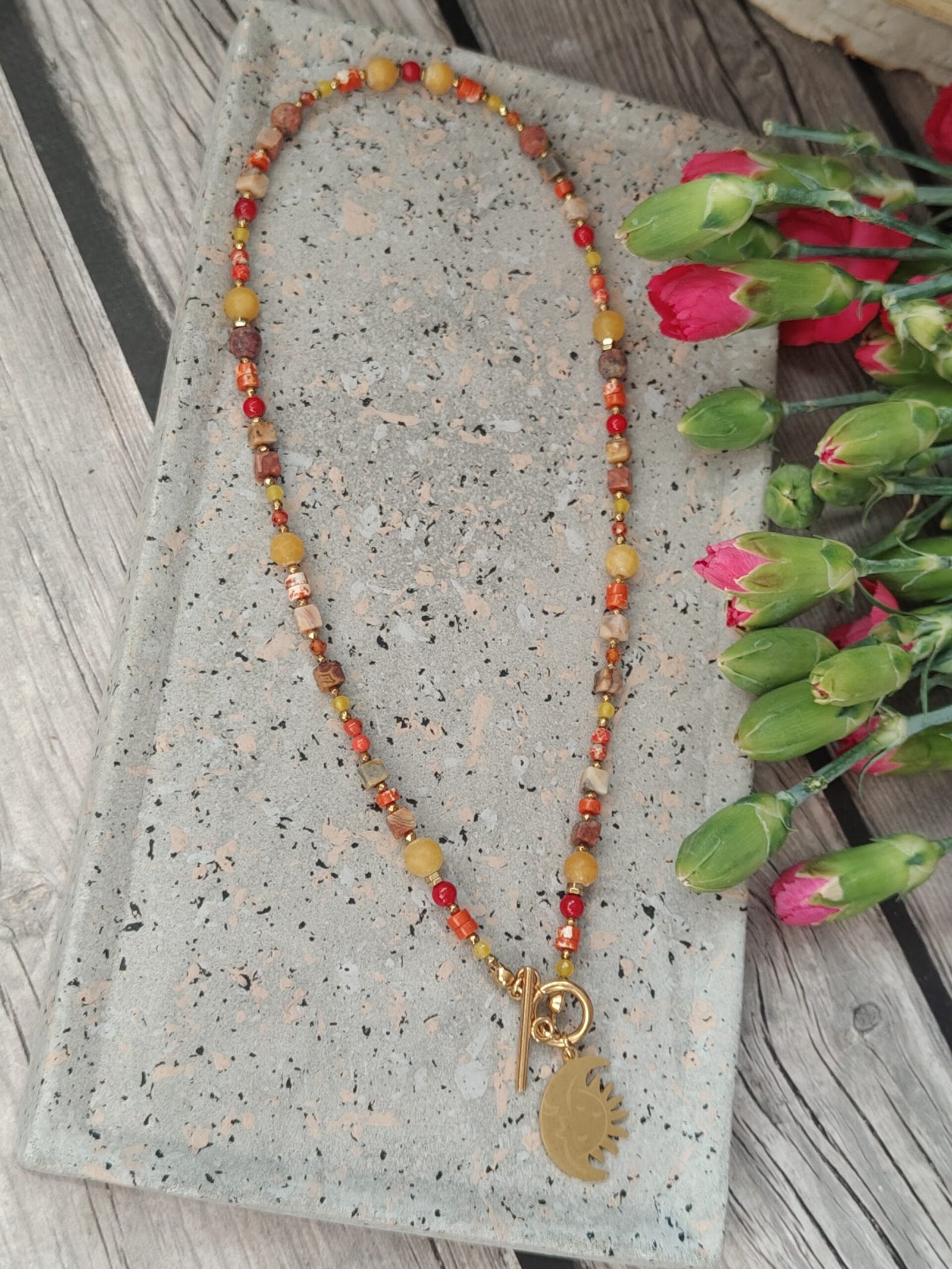 Energetyczny naszyjnik emanujący ciepłem ziemi i blaskiem słońca. Wykonany z czerwonego i pomarańczowego jaspisu, agatu, hipnotyzującego kociego oka i harmonizującego jadeitu. To amulet pasji, działania i emocjonalnej stabilności – dla osób, które żyją z sercem i nie boją się iść własną drogą.