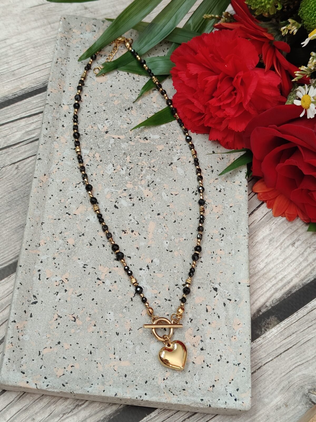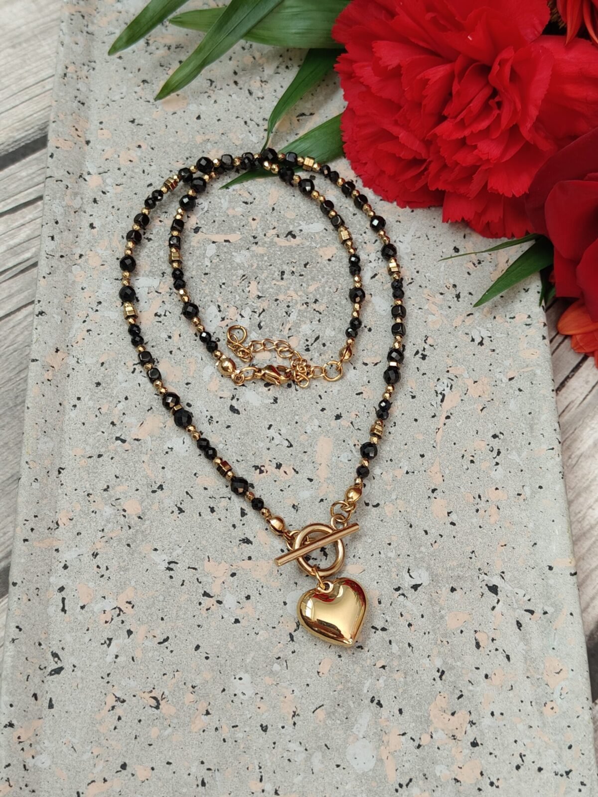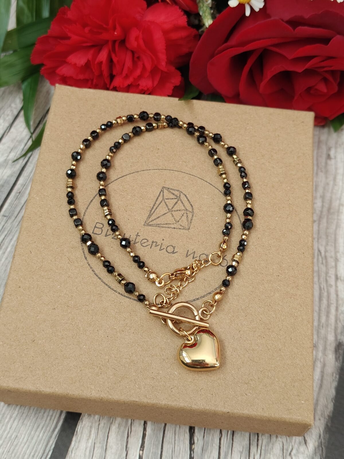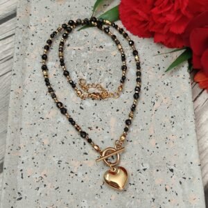 Naszyjnik posiada dwa zapięcia, z przodu wykończony stylowym zapięciem typu toggle oraz zawieszką w kształcie serca ze stali chirurgicznej, z tyłu zapięcie na karabińczyk z regulacją. Łańcuszek pozwala dopasować naszyjnik w zakresie długości 42-47 cm.